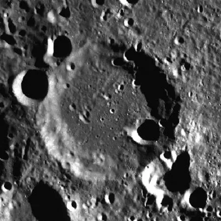 Крупный ударный кратер на юго-западной границе Моря Москвы на обратной стороне Луны.