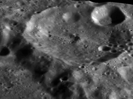 Большой древний ударный кратер на юго-восточном побережье Моря Москвы на обратной стороне Луны.