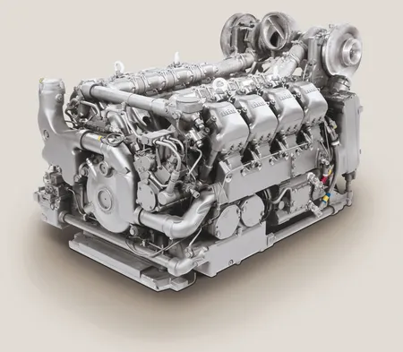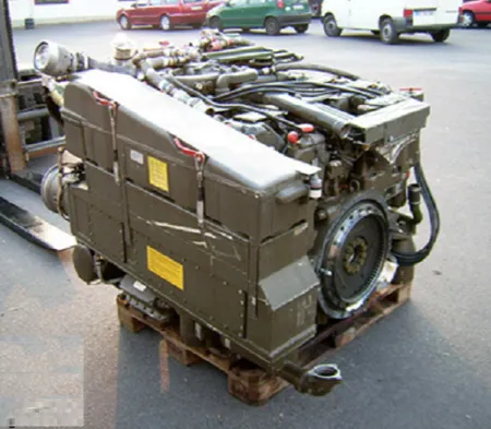 Многотопливный V-образный 12-цилиндровый четырёхтактный дизельный двигатель мощностью 1500 л. с. при 2600 об/мин. Разработан и производится германской фирмой MTU. Относится к дизелям предкамерного типа, с жидкостным охлаждением и турбонаддувом. На двигателе размещены два турбокомпрессора и два охладителя входящего воздуха, включенные в общую систему охлаждения. Воздух для питания двигателя поступает через два воздухозаборника, расположенные на крыше МТО и прикрытые сверху кормовой нишей башни, в два воздухоочистителя, закреплённые с двух сторон на двигателе и соединённые короткими патрубками с турбокомпрессорами. Воздухоочистители — двухступенчатые. Пыль, отфильтрованная на первой ступени, удаляется электровентиляторами.