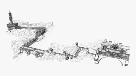 Часть коридора, соединяющего во Флоренции Палаццо Веккьо с Палаццо Питти, включает мост Понте Вьекко через реку Арно и составляет его верхний ярус.Статуя Бенвенуто Челлини